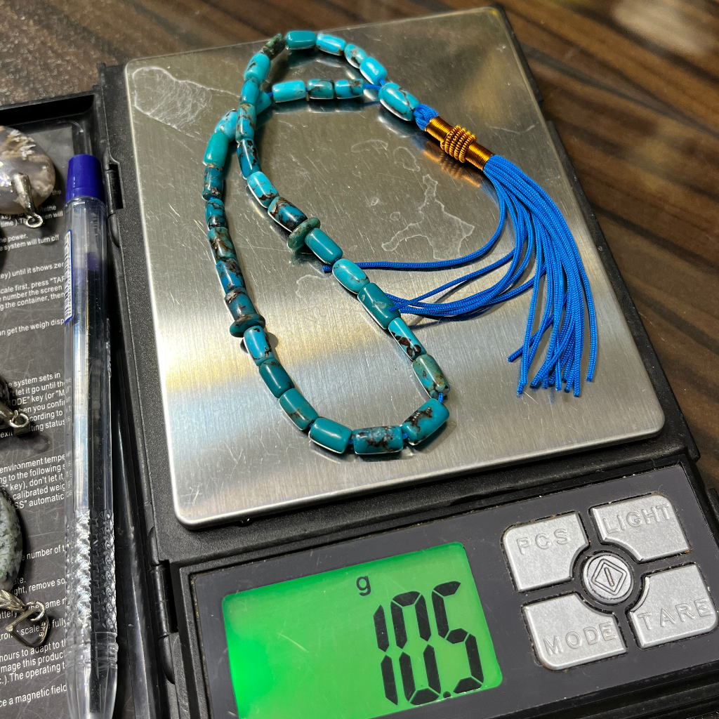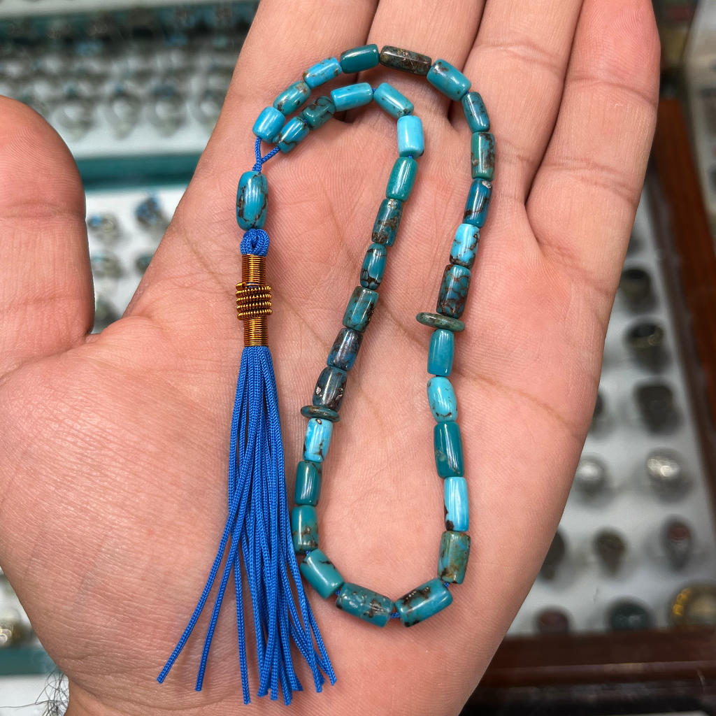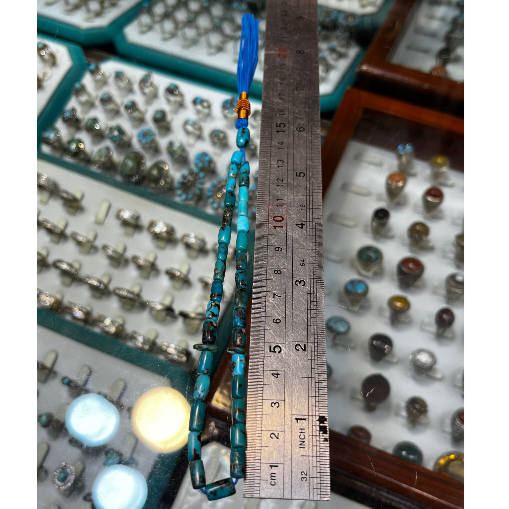 این تسبیح فاخر، از سنگ اصل فیروزه نیشابور با دانههایی خوشتراش و سایز مناسب ساخته شده؛ بافت طبیعی و رنگ آبی خاص آن، گواهیست بر اصالت و کیفیتی بینظیر. هر دانهاش، روایتیست از تاریخ، طبیعت و دعا.
